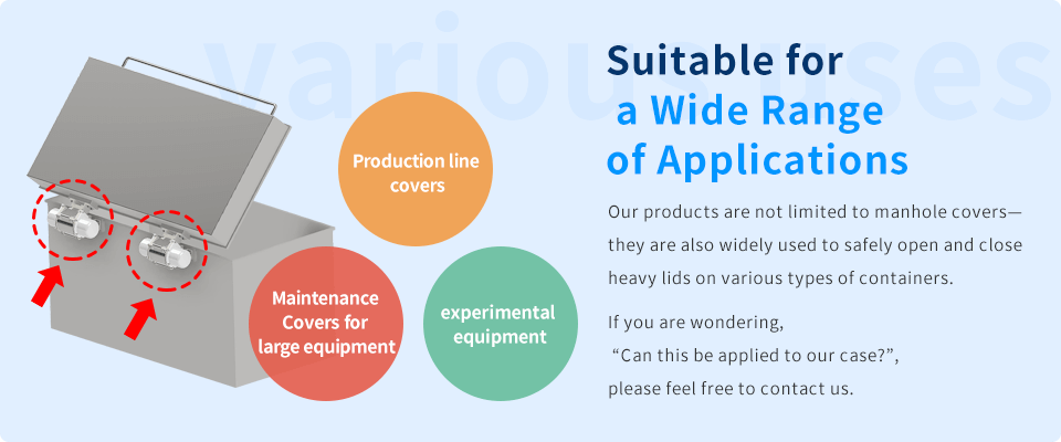 A cosmetics manufacturer that opens and closes the tank lid dozens of times per day has expressed satisfaction with the high durability of the product, saying, "It can be used stably even when used for long periods of time and at high frequency. The high durability of the product is also satisfactory. In addition, since the spring can be easily replaced, the product can be used for an even longer period of time.