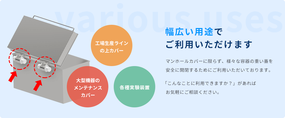 フリーストップ型は任意の角度で蓋が止まる為、「女性従業員の方でも簡単に重たい蓋を開閉できる。」とのお声をいただきました。また、フリーストップ型は全て防水処理がされているため、キャップバランサー内で使用しているグリース等の混入の心配はございません。